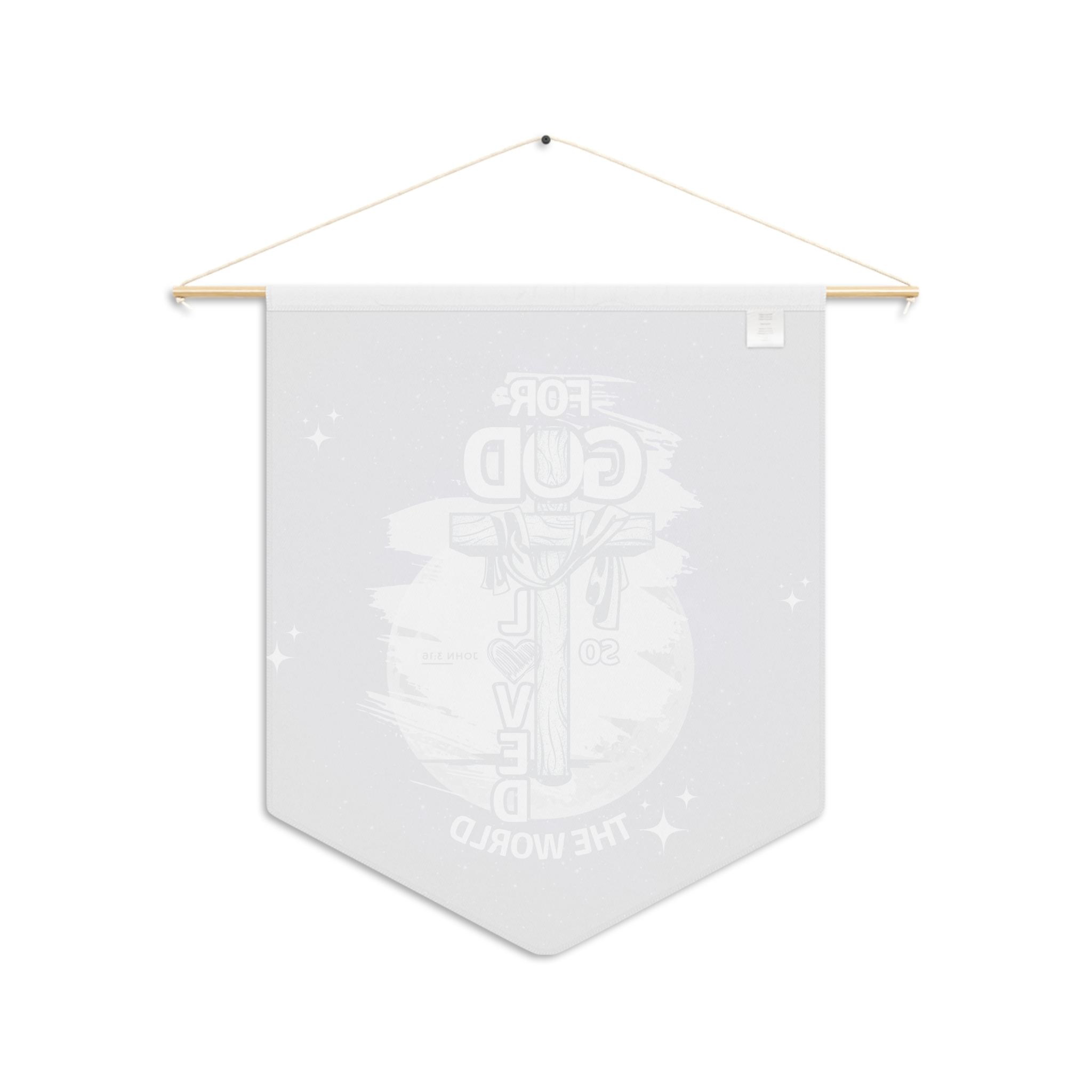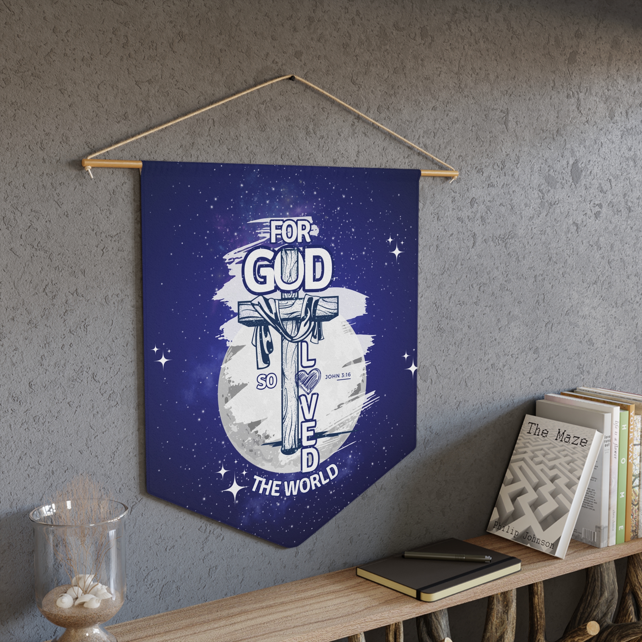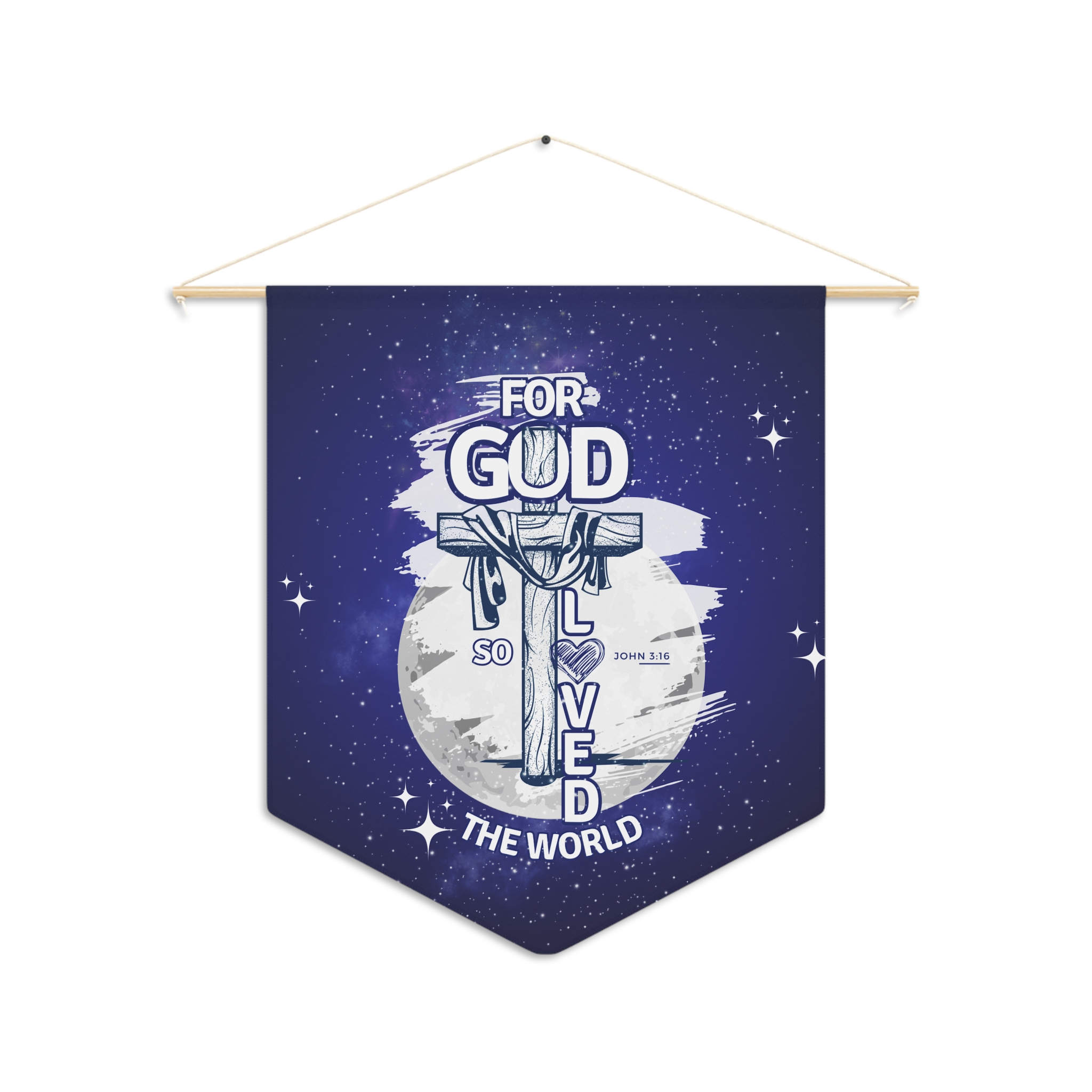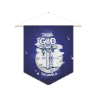 This deep-blue pennant carries John 3:16 across a backdrop of stars and heavens, a quiet reminder of a love that stretches beyond walls and routines. Hang it where you pause—above a desk, beside a reading chair, or in a shared kitchen—and let the phrase settle into the room. The space-inspired print makes the verse feel vast and steady, like a small window to the infinite. It reads gentle but sure, a daily nudge toward gratitude and faith for anyone who treasures scripture and contemplative décor.
