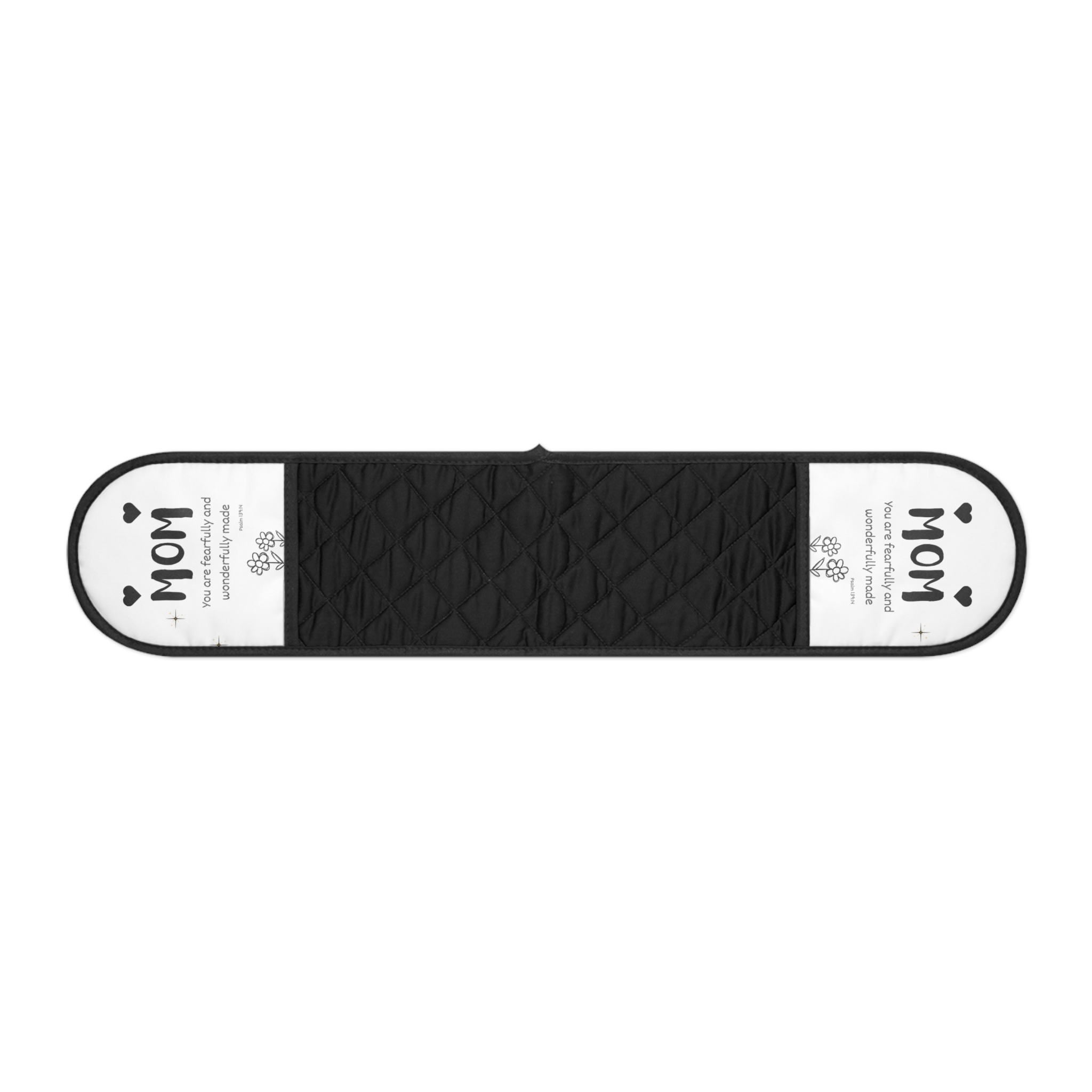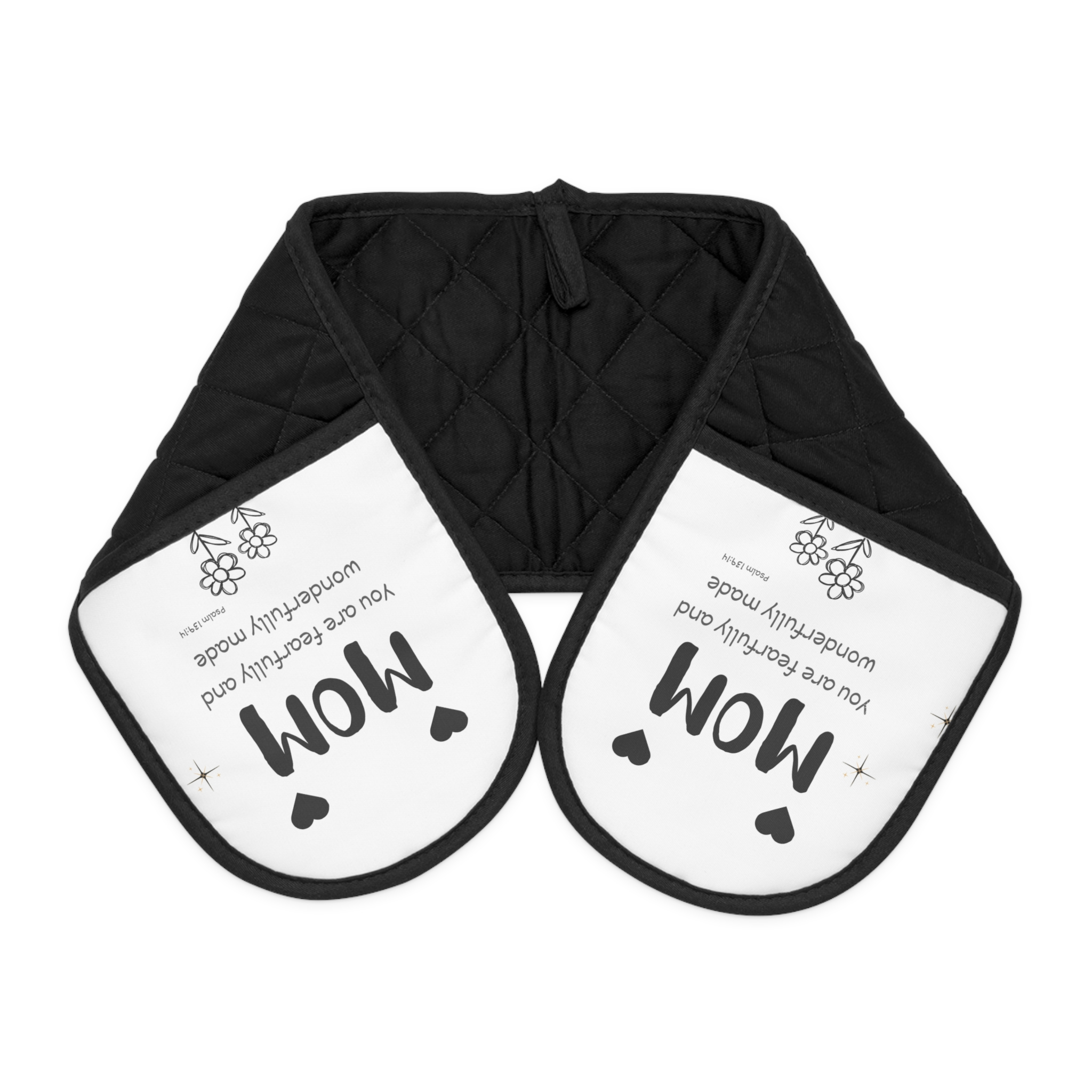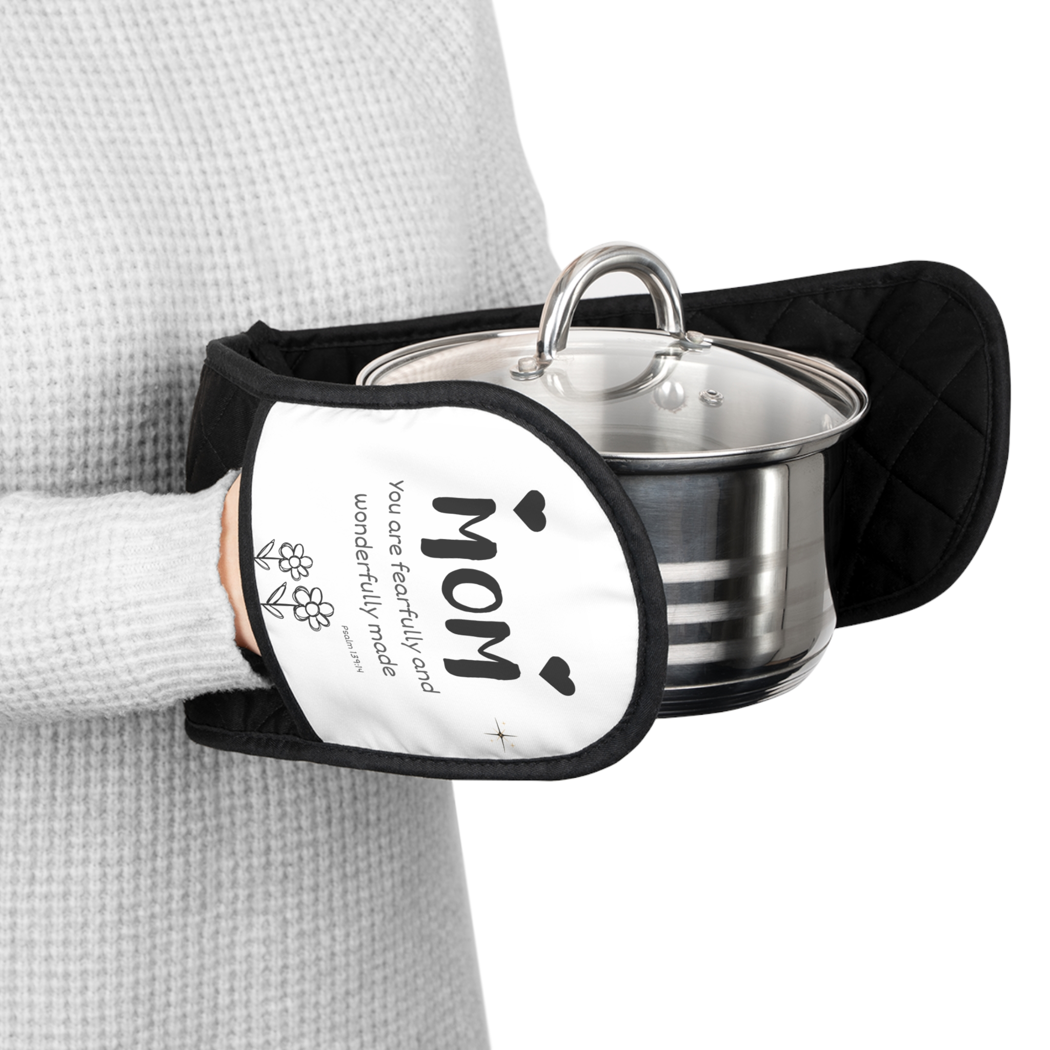 Black oven mitt crafted to be a quiet, daily reminder of love. The simple, elegant design carries the verse “You are fearfully and wonderfully made,” so every time Mom reaches for a hot pan she feels seen and cherished. The slim silhouette and soft hand invite frequent use while the verse sits like a gentle affirmation in the kitchen — a small moment of faith woven into the routine of cooking and family meals. It suits slow Sunday breakfasts, weekday dinners, and holiday baking sessions where words and warmth meet. Subtle and reverent, this mitt blends practical protection with a thoughtful message that stays close to the hands that feed the family.