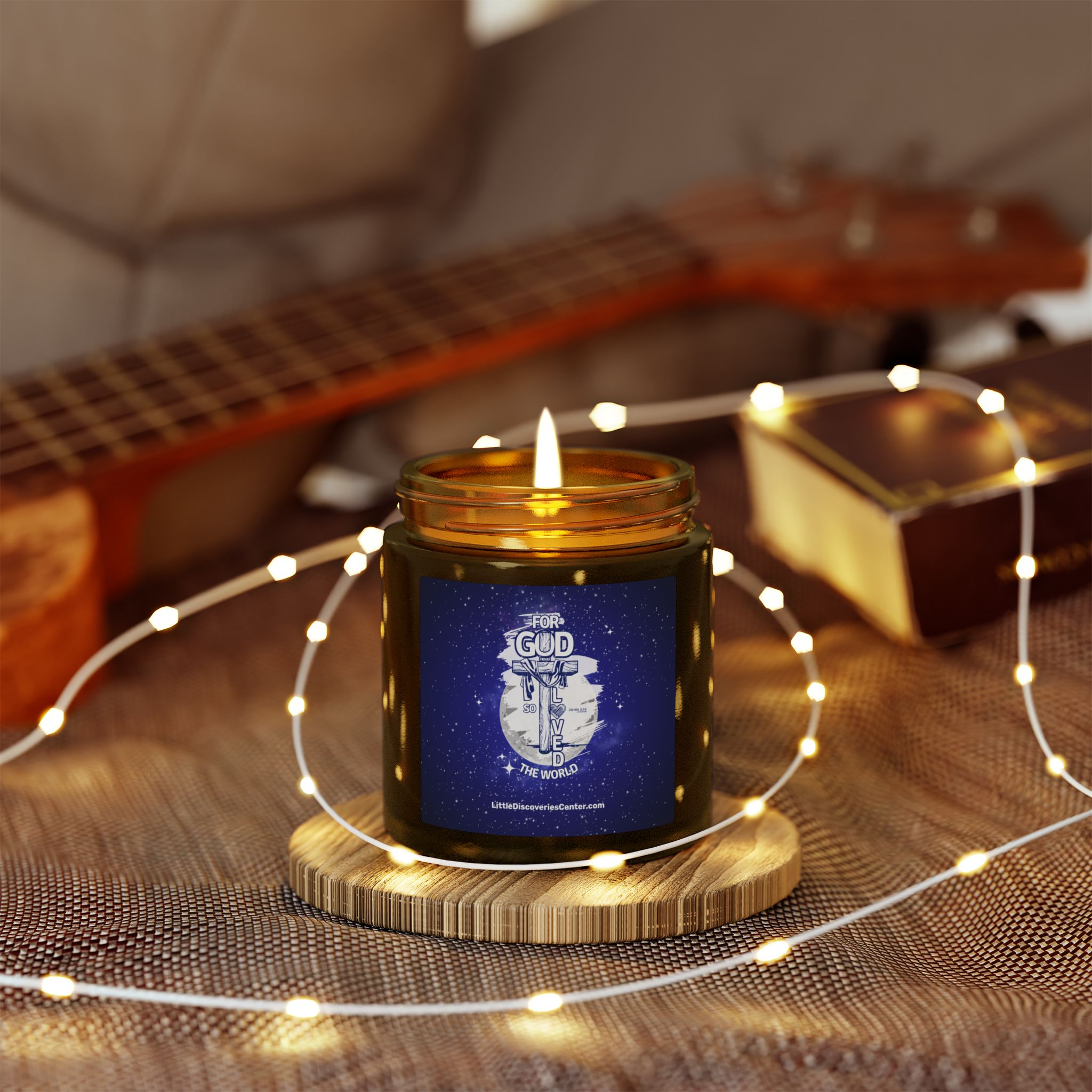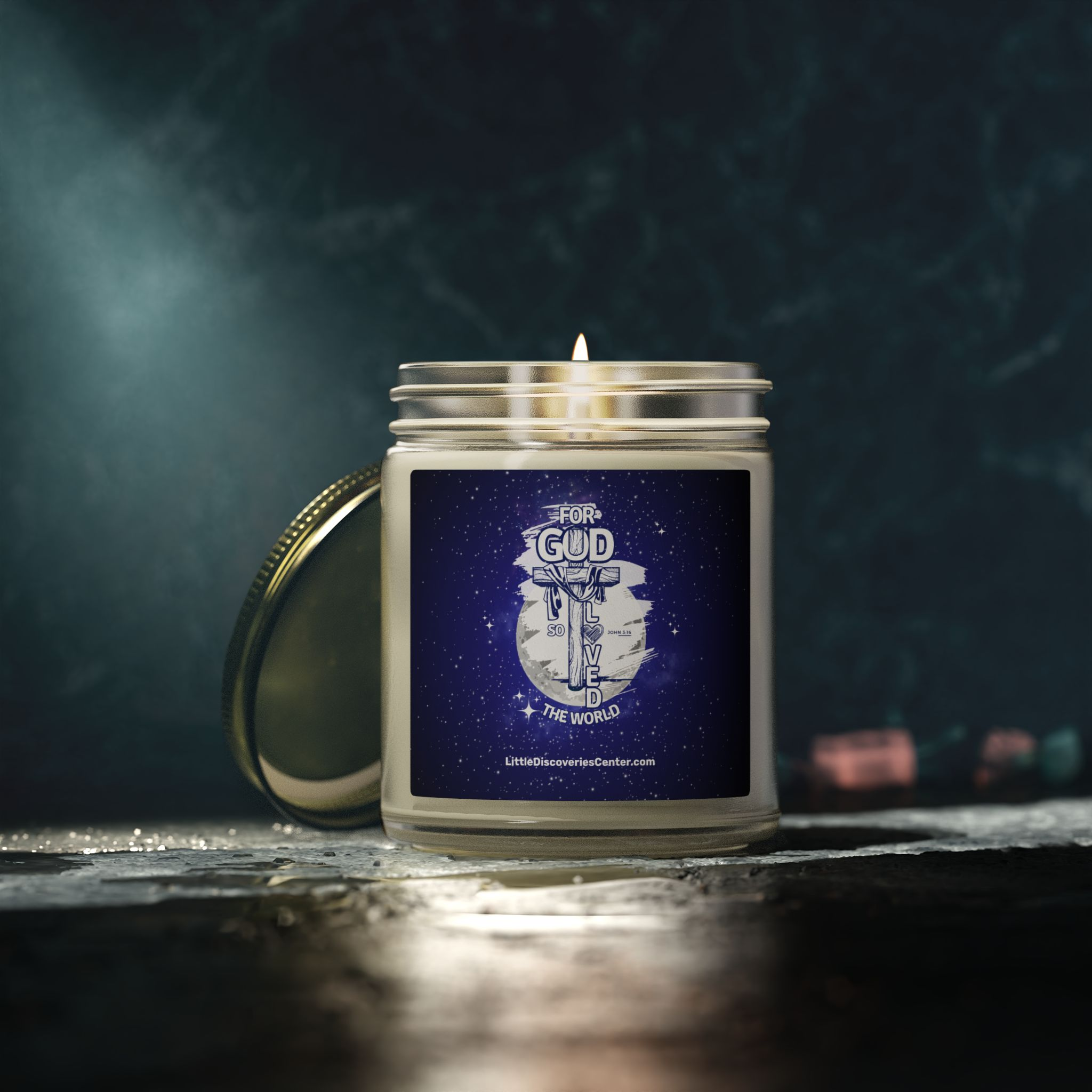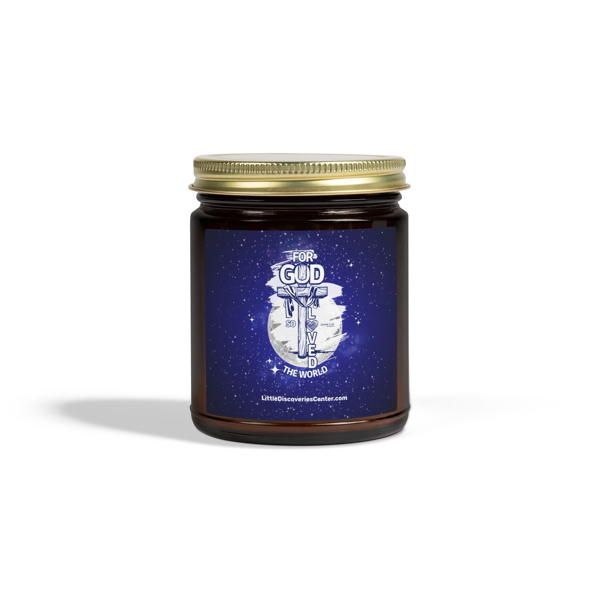 Light this candle and let a quiet pulse of John 3:16 settle the room. Deep blues and soft whites paint a little slice of the heavens on the label — a visual reminder that love stretches beyond walls and schedules. The glow is gentle, the scent chosen to wrap you in calm: a cedar-and-amber embrace, a warm vanilla hush, or a clean citrus breeze depending on the fragrance you select. Each vessel is hand-poured with coconut-apricot wax and a cotton wick, so the flame burns clean while you pray, reflect, or simply breathe. Keep it on your nightstand during evening devotion, place it by the window for Sunday morning stillness, or light it after a long day to recall that you are seen and loved by a vast sky of grace.